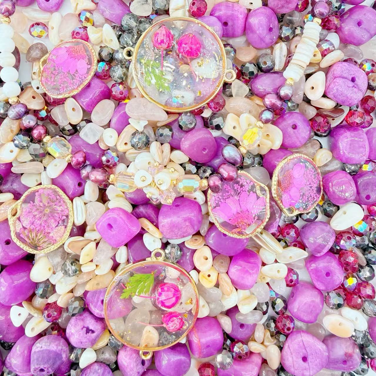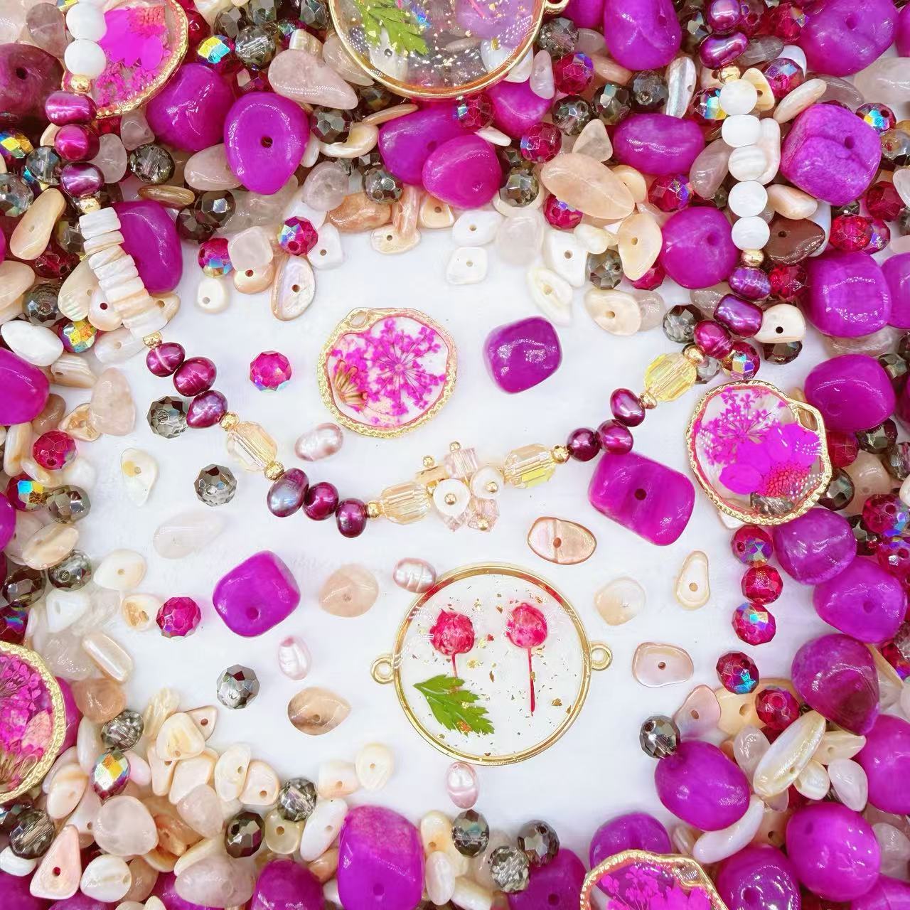 Hey fashion visionaries! 🌸✨ Ready to channel literal "Radiant Garden Gala" energy? Our Fuchsia Flush mix is the ultimate definition of Vogue High-Fashion Storytelling, featuring breathtaking Gilded Real-Pressed-Flower Medallions that radiate intense editorial brilliance with their striking hot-pink petals and shimmering golden armor textures. We’ve curated a majestic hoard of Midnight Magenta Baroque Pearls, shimmering Mother-of-Pearl shards, and architectural Fuchsia Raw-Stone relics designed for that legendary, front-page-worthy look! 💎🌿🩰