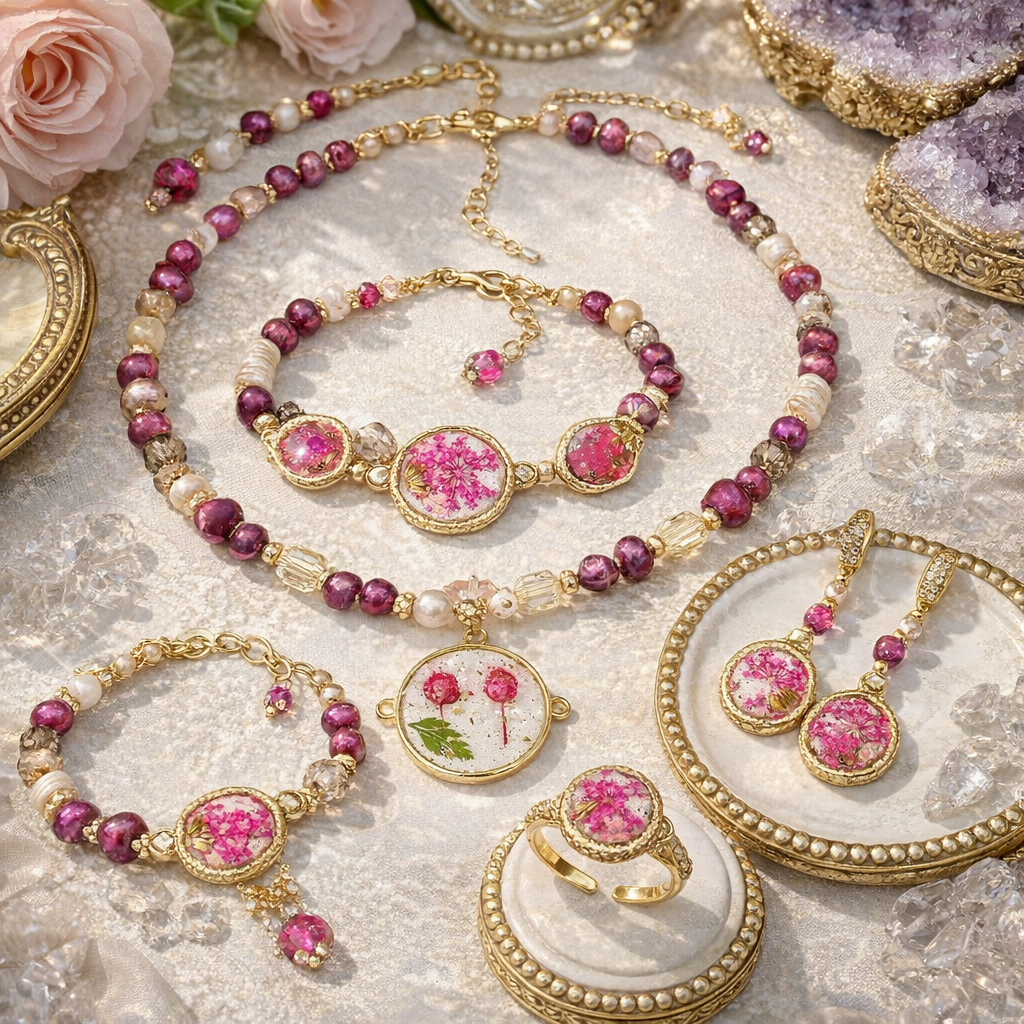 #FuchsiaFlush #VogueAesthetic #HighFashionJewelry #BotanicalLuxe #DIYJewelry #PinkAndGold #LoveJulies #HandmadeLuxury #JewelryInspo #ShopJulia #PressedFlowerStyle #FashionEditorial #MagentaMagic #StatementCharms #CraftYourJoy #RunwayReady