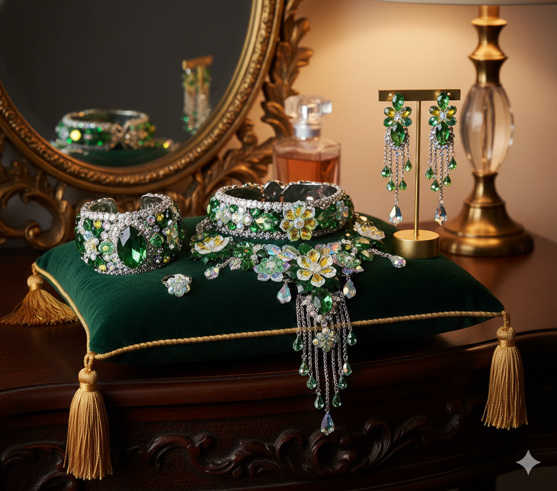 #ForestVibe #VogueAesthetic #HighFashionJewelry #EmeraldLuxe #DIYJewelry #GreenAesthetic #LoveJulies #HandmadeLuxury #JewelryInspo #ShopJulia #GreenAndGold #FashionEditorial #BotanicalStyle #StatementCharms #CraftYourJoy #RunwayReady