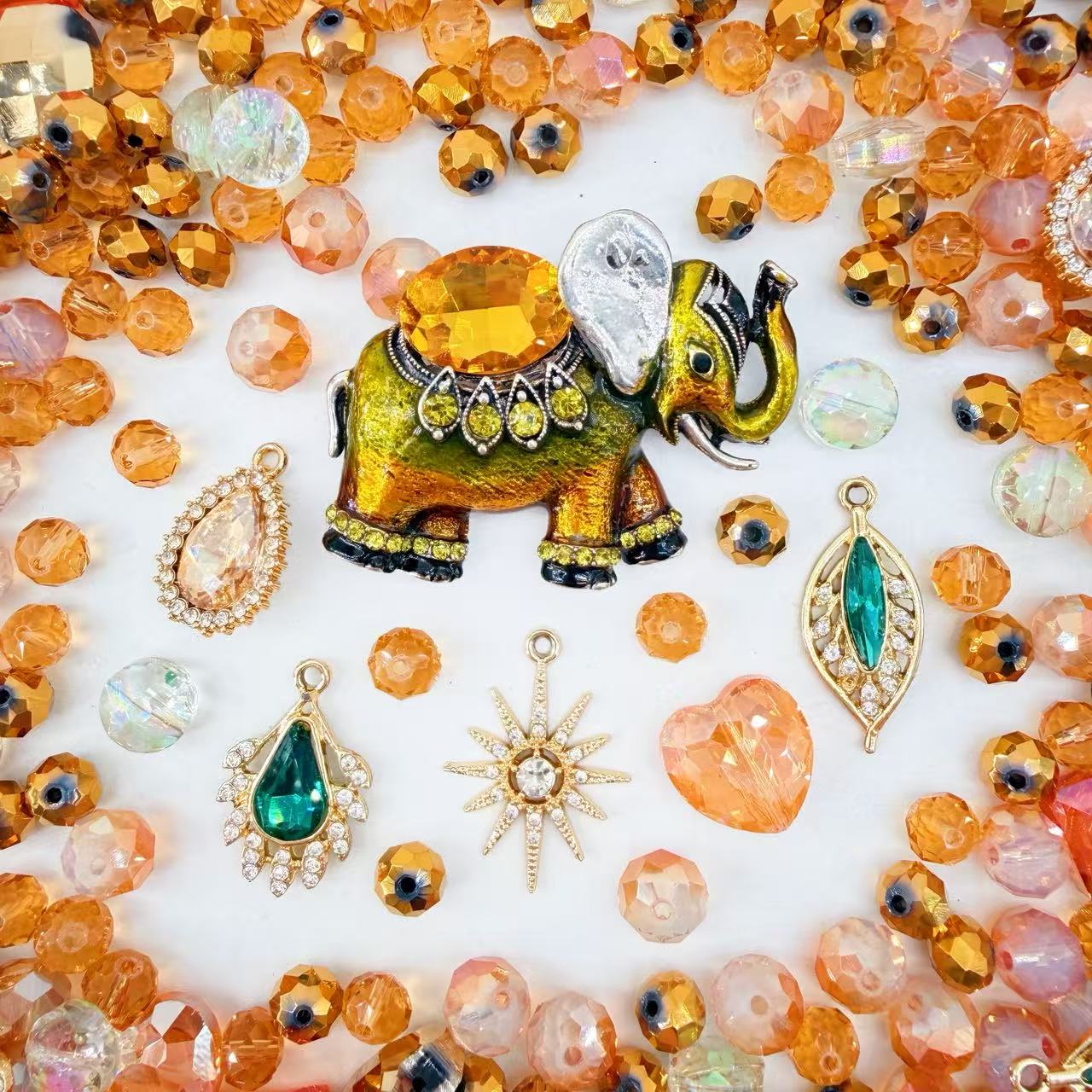 Hey fashion visionaries! 🐘☀️ Ready to channel literal "Sahara Goddess" energy? Our Desert Gold mix is the ultimate definition of Vogue High-Fashion Storytelling, featuring a breathtaking Couture Enamelled Elephant Medallion and Emerald Starburst relics that radiate intense editorial brilliance with their striking contrast between majestic amber facets and shimmering verdant accents. We’ve curated a majestic hoard of Crystal-halo Teardrop shards, shimmering Faceted Amber Heart relics, and architectural Marquise-cut Emerald charms designed for that legendary, front-page-worthy look! 💎👑🏜️