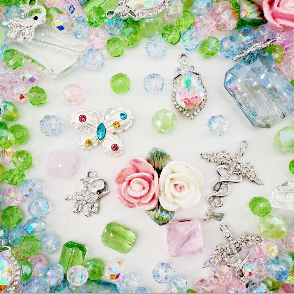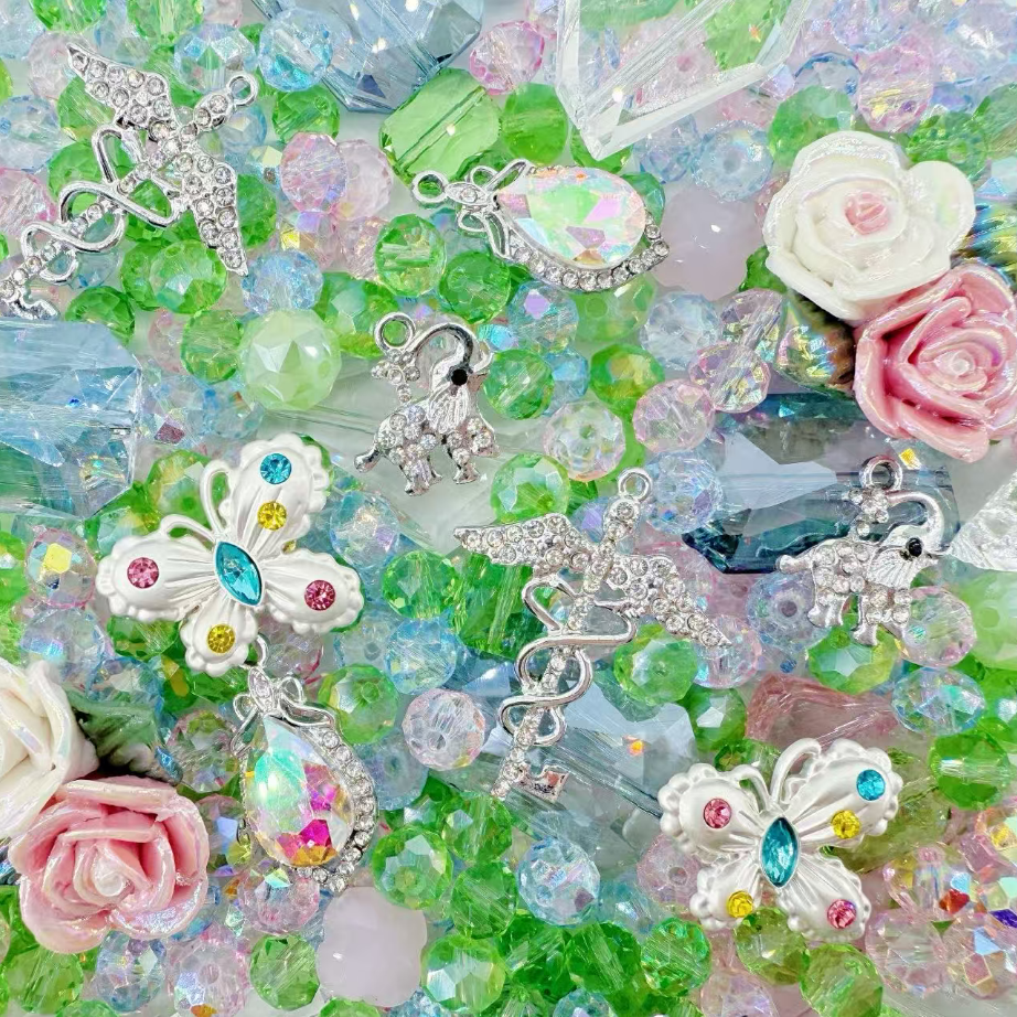 Every charm carries its own story: a playful butterfly with rainbow gems, an elegant winged key, and a sprinkle of iridescent beads that reflect the light like tiny stars. 🌟💫 The balance of silver, crystal, and soft floral hues makes this set perfect for whimsical accessories, from charm bracelets to dreamy keychains.