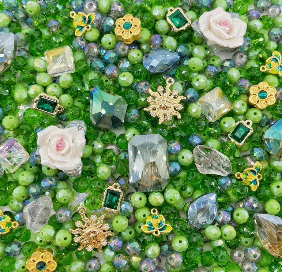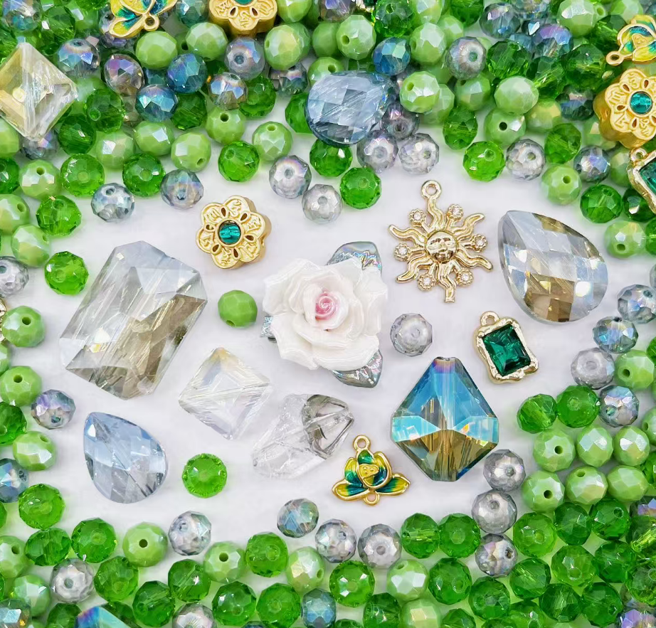 The palette is bright yet elegant—balancing natural greens with sparkling crystal tones for a chic, fashion-forward vibe 💎🌼. Whether you’re designing whimsical earrings, statement necklaces, or delicate bracelets, this set brings the beauty of the outdoors into high-fashion jewelry.
