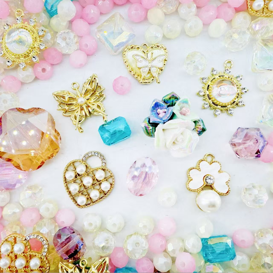Sunny Day is a dreamy curation of charms that feels like a sunlit morning turned into jewelry. Golden butterflies, pearl-filled hearts, and delicate florals sparkle among soft pink, ivory, and aqua beads, giving every detail a cheerful, romantic glow.