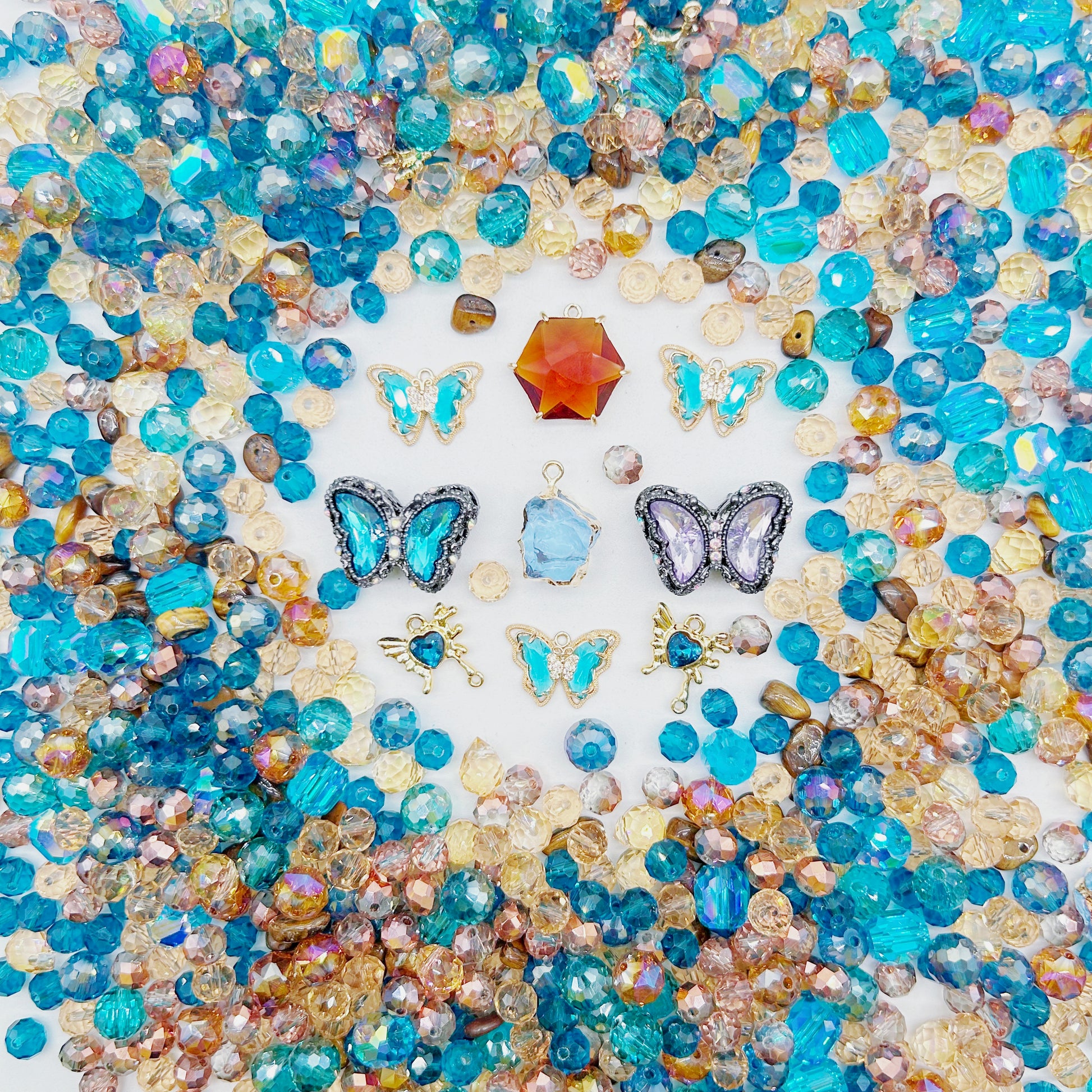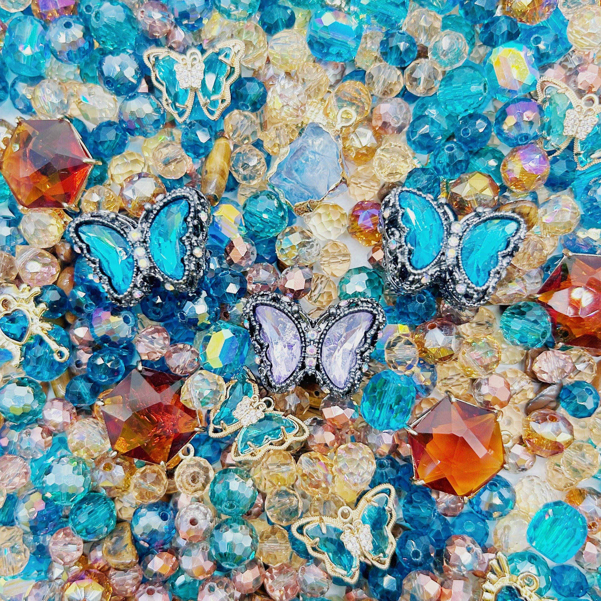OMG besties, get ready to fall in love with Beaded Bliss! 💖 This mix is a total mood, blending that iconic 70s retro sunshine with a dreamy, coastal vintage vibe that is literally everything. We’ve curated a stunning hoard of faceted aqua beads that shimmer like the Mediterranean, paired with warm honey-amber crystals and raw, "found-object" style stones. The stars of this collection are the breathtaking butterfly charms—from delicate gold-wired teal beauties to heavy, ornate silver-framed statement pieces with lilac and deep azure wings. 🦋✨