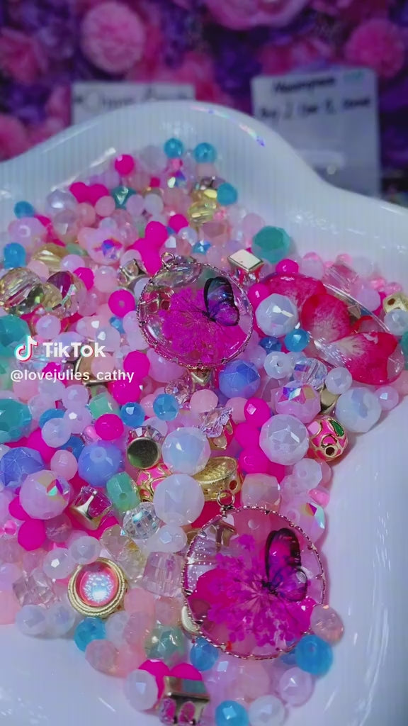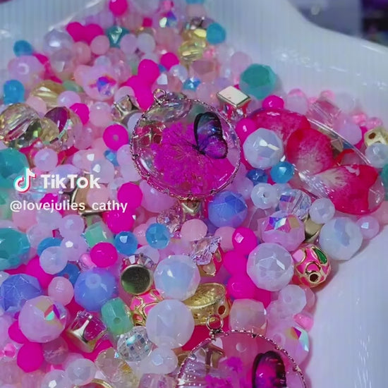 Every charm tells its own story: a delicate butterfly resting on violet blooms, jade-green pendants wrapped in golden vines, and pressed petals sealed in crystal resin. Together with radiant beads and candy-hued orbs, they create a whimsical palette that feels like riding a carousel on a spring afternoon. 🎠🌷