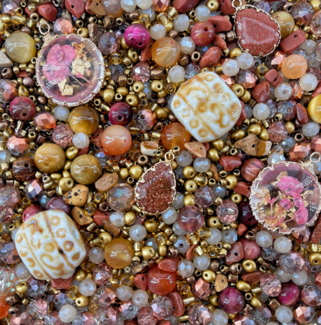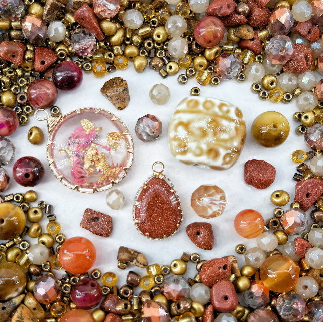 “Sunrise” is a golden burst of warmth and radiance 🌞✨. This mix features charms like a shimmering resin pendant with delicate pink flecks, a glowing teardrop gem, and natural stone accents that echo the first light of dawn. Surrounded by beads in bronze, amber, coral, and sandy neutrals, the palette feels like watching the sky shift from soft blush to fiery gold.