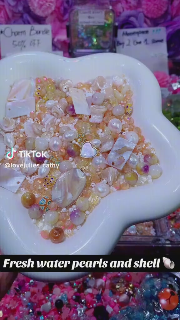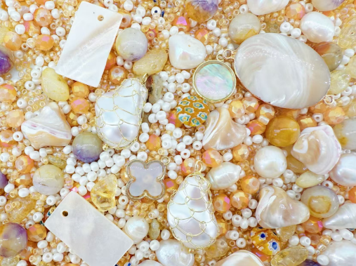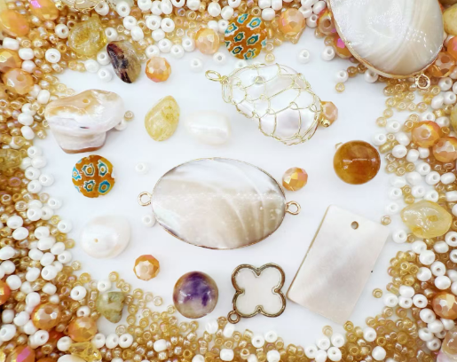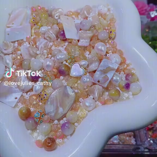 Glitter Gold is a warm and radiant mix of golden tones, ivory beads, and earthy stones that shine like sunlight over sand. With creamy shells, glossy pearls, and intricate charms, this set captures the beauty of timeless elegance and classic glamour. 🌞✨