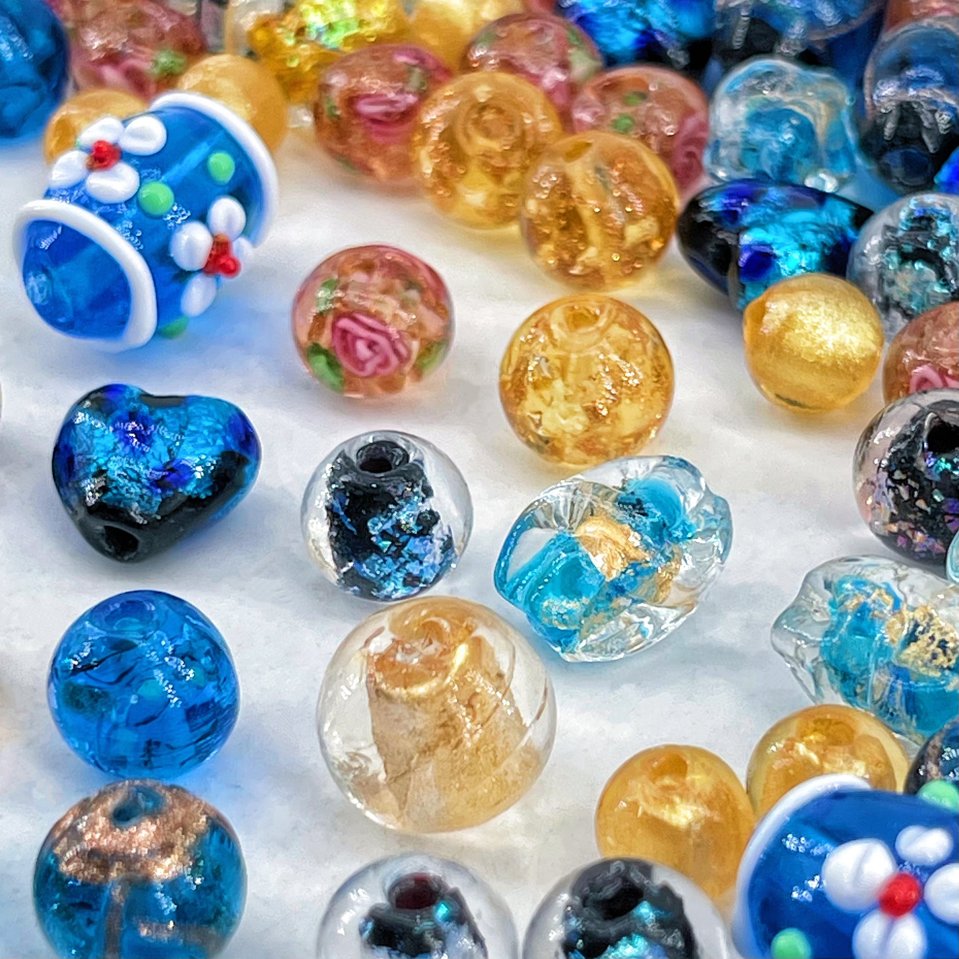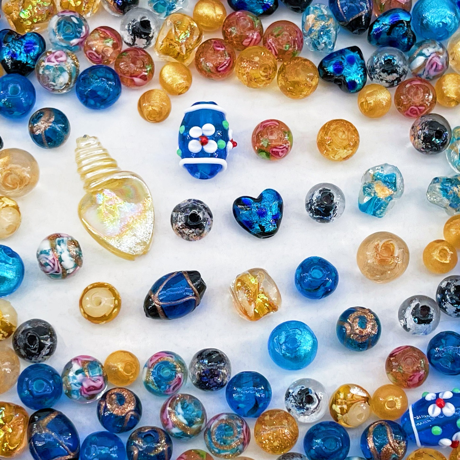 ✨ Golden Lagoon is a dreamy mix where deep ocean blues meet molten gold. This set features hand-blown beads with swirls of navy and turquoise, shimmering gold foil hearts, and tiny lampwork treasures that look like they were scooped straight from a hidden lagoon. 🌊💛 Each charm carries its own little sparkle, from iridescent hearts to glass beads kissed with hints of rose and amber.