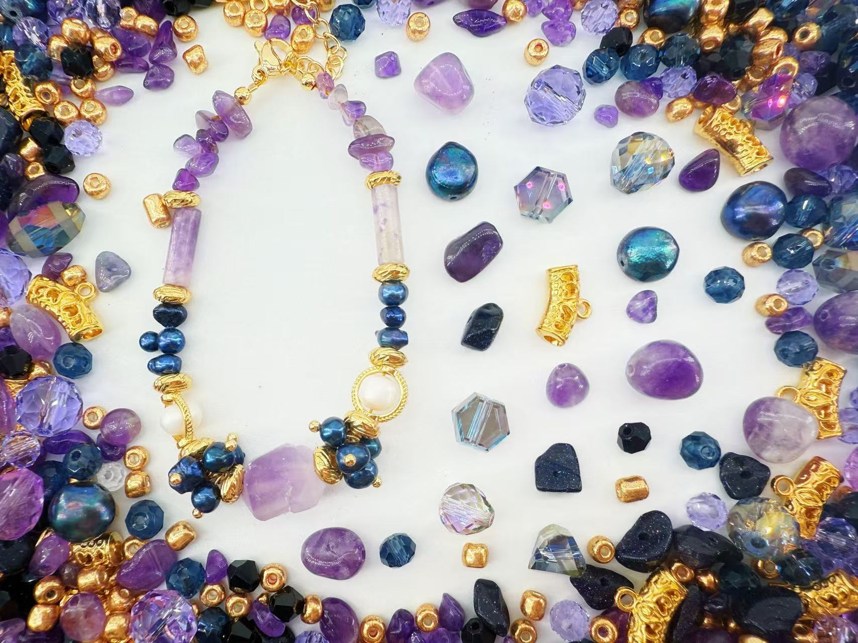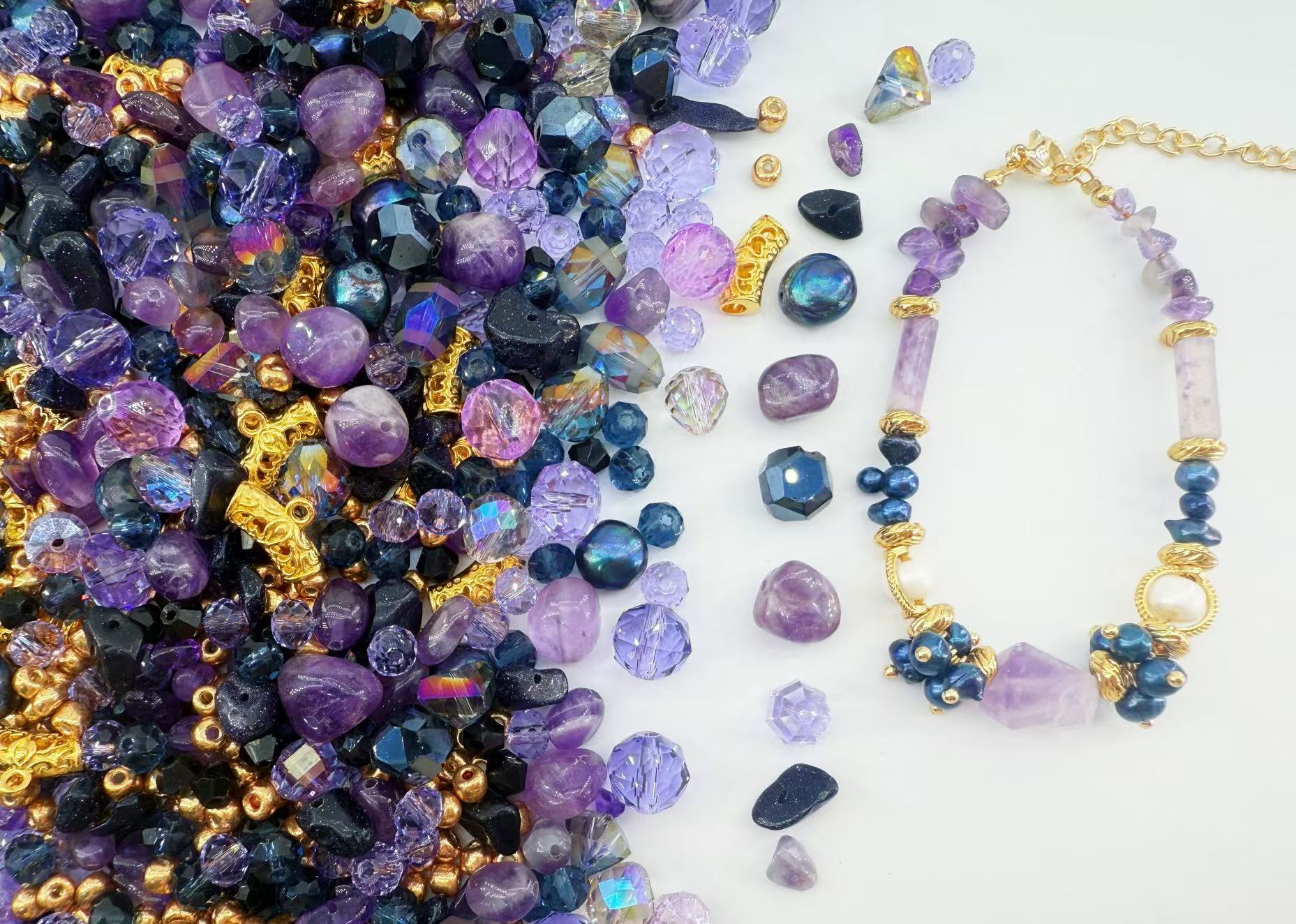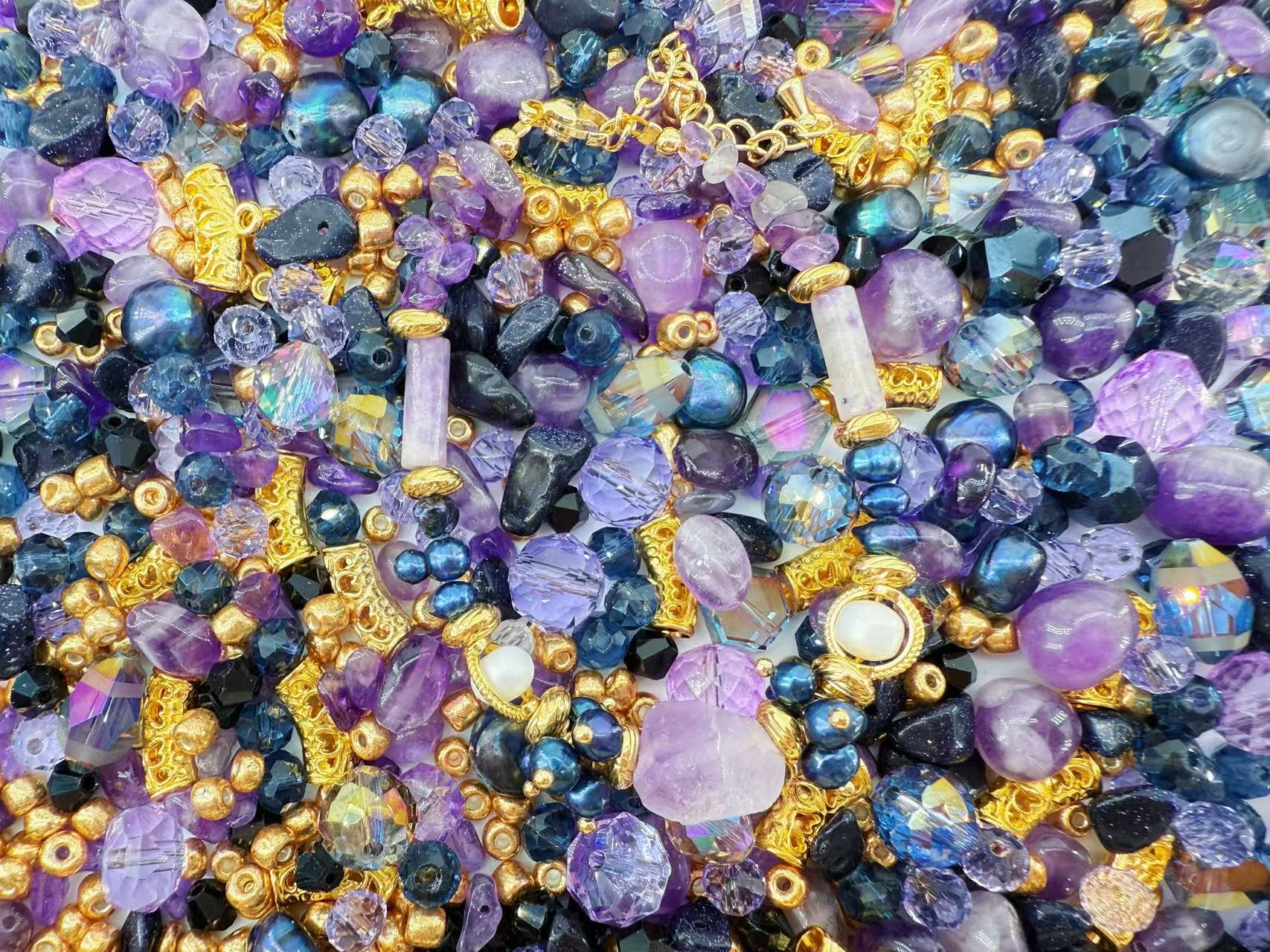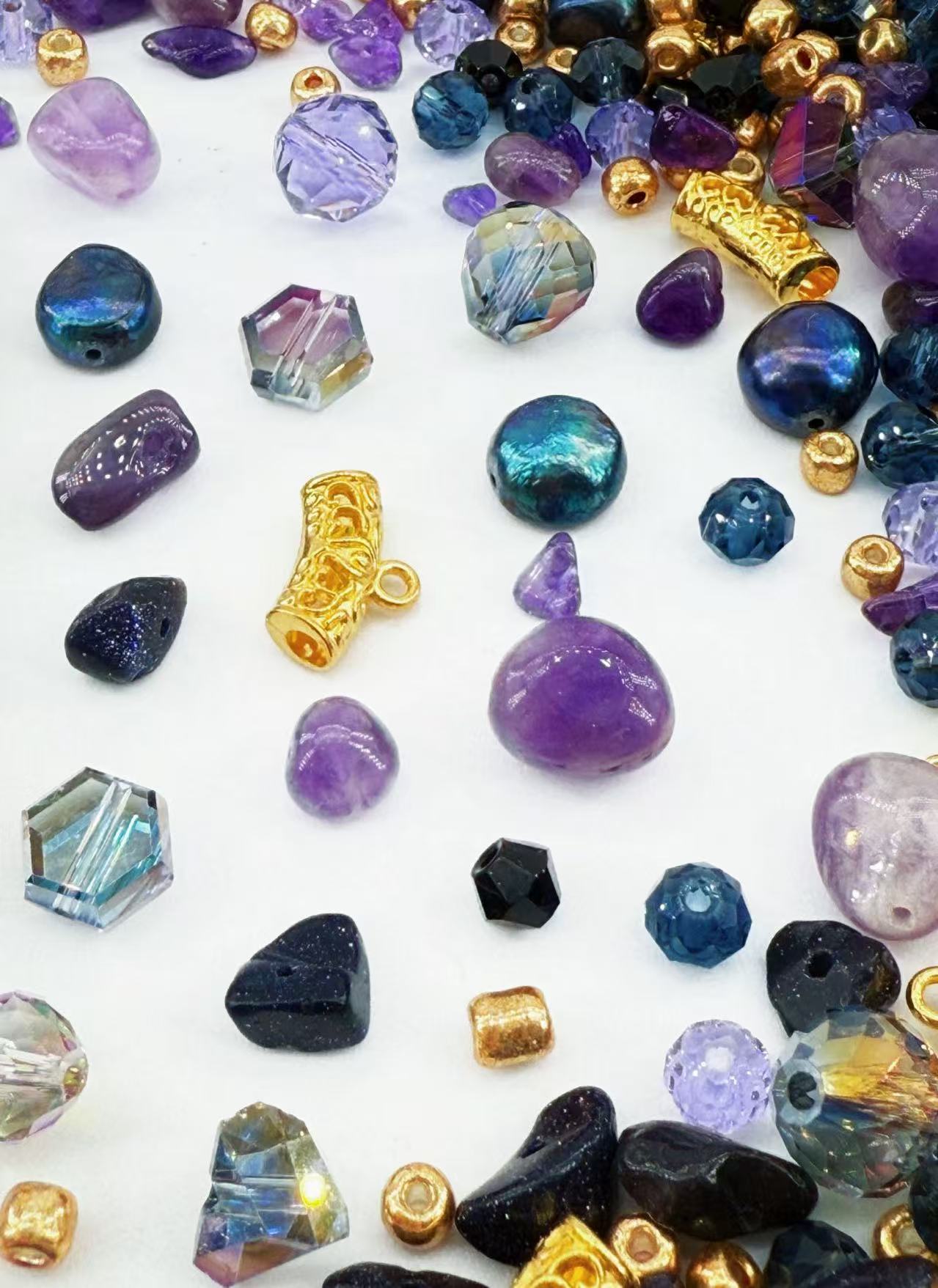Every bead tells a story — from smooth amethyst-like stones to sparkling navy gems and golden filigree charms. The contrast of dark jewel hues against glimmers of light evokes the velvet sky scattered with stars, perfect for designs that are both regal and enchanting. 🌌👑