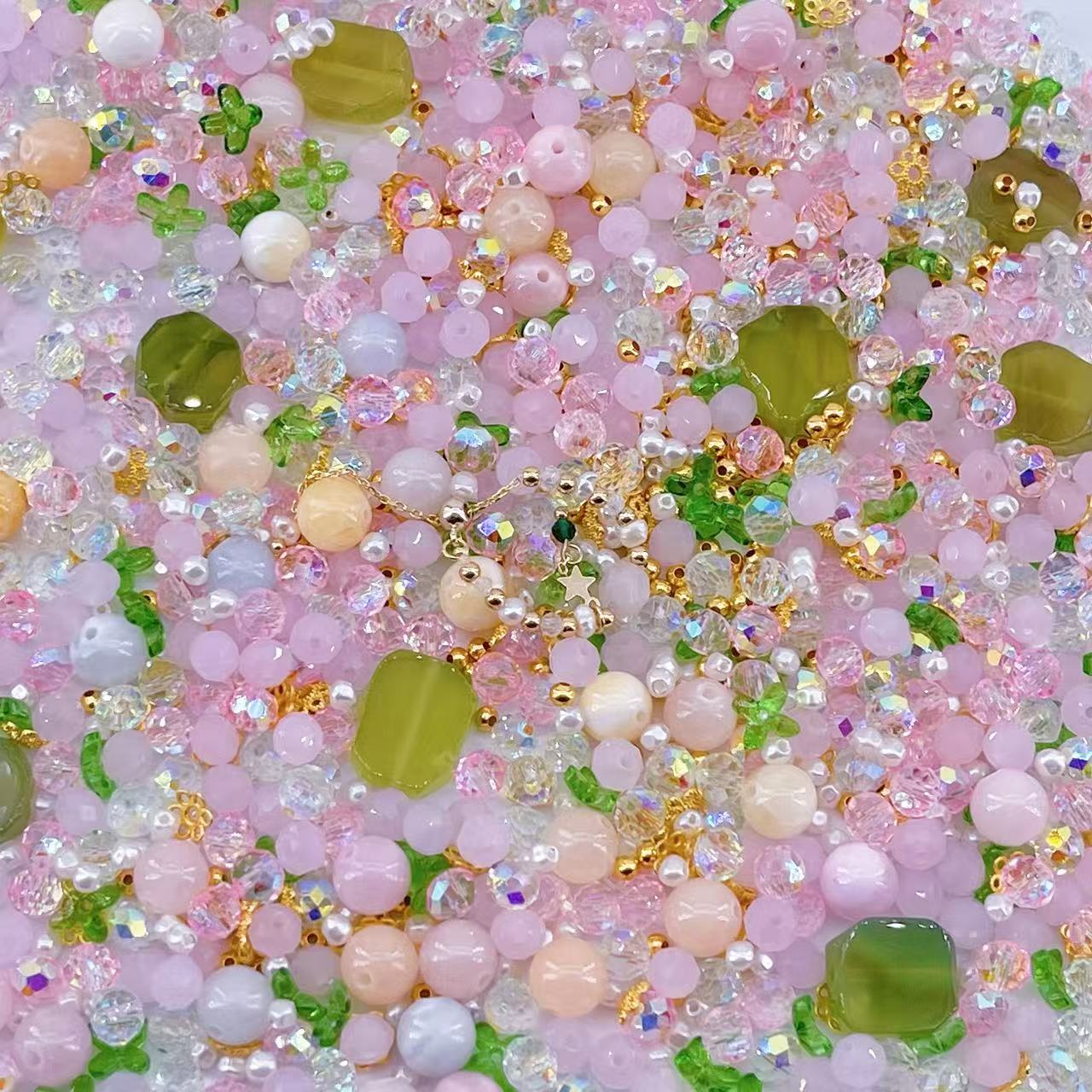 This mix features adorable green flower charms, glossy pastel rounds, and shimmering faceted beads that glow like morning dew. The soft jade-green piece adds a grounding, earthy vibe, while golden accents make everything feel luxurious yet playful. It’s a perfect balance of nature, magic, and pastel sweetness. 🍃🌸💛