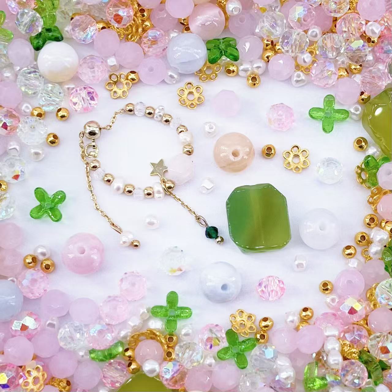 Step into a gentle fairytale bloom with Spring Awakening, a mix filled with soft pastels and fresh garden tones. Delicate pink, pearl white, and dew-green beads create a soothing palette that feels like the very first morning of spring. At the center, a tiny gold-star charm paired with a dainty bracelet brings a sweet, celestial touch—like sunlight sparkling through new leaves. ☀️🌿✨