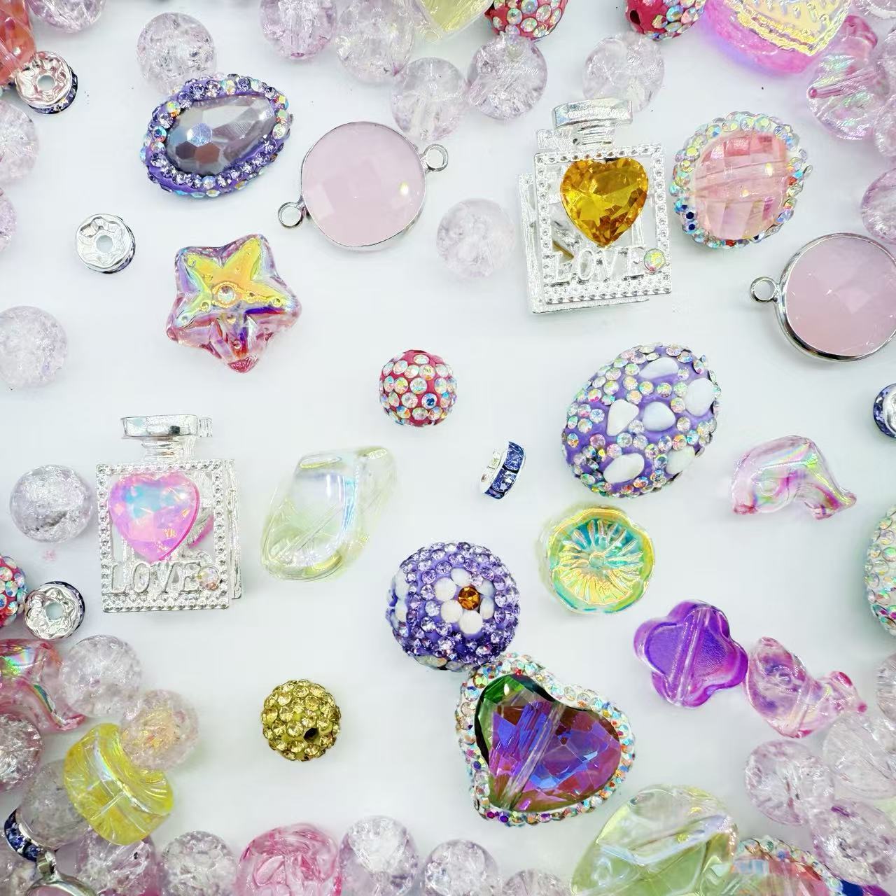 This mix feels like opening a magic perfume bottle—glittering hearts, juicy candy colors, and crystal charms that sparkle like sugar. The tiny perfume-bottle pendants with crystal hearts make it look like a treasure from a fairytale vanity, while pastel stars, rainbow beads, and crackle glass balls add a sweet, sparkling vibe. Every charm looks delicious, glossy, and glowing, just like the name—cute, enchanting, and full of fantasy energy. 💗✨