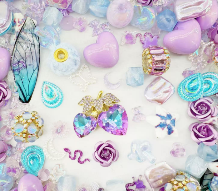 Each piece captures the magic of a twilight vineyard — from iridescent teardrops to pastel wings and shimmering crystals, all dancing under a gentle glow. Their playful yet elegant mix makes this collection perfect for crafting statement earrings, charm bracelets, or dreamy bag charms. 💜💫