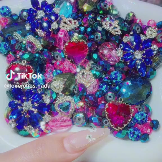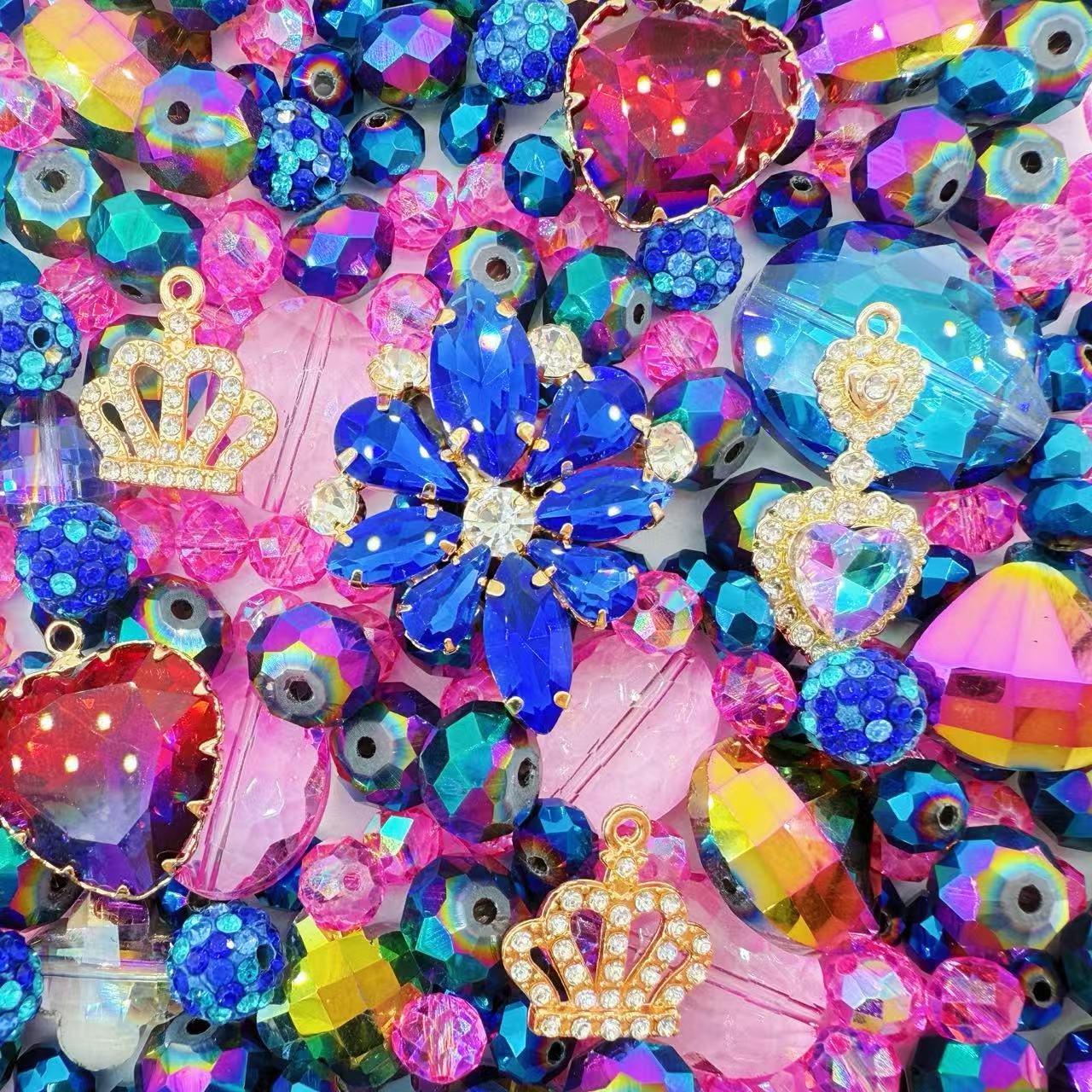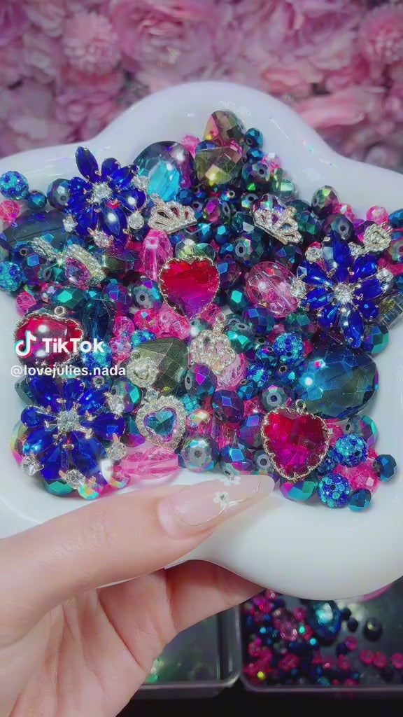 Say hi to Crown & Crystal, the ultimate sparkle mix for anyone who believes life is better in royal color. Deep sapphire blues, hot pink highlights, and rainbow-shifting crystals come together like a princess treasure box dropped straight from a magical castle. The centerpiece charms—crystal crowns, royal hearts, and bold-cut gems—feel perfectly dramatic, glamorous, and totally fairy-approved.