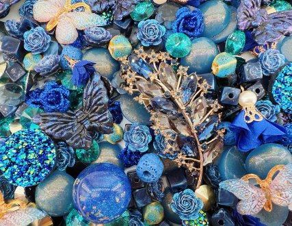 Step into Fairyland, where deep sapphire blues, shimmering aquas, and iridescent emeralds tell a story of magic under moonlit skies. 🌙✨ At the heart of this mix, delicate butterflies, glittering florals, and a sparkling leaf brooch capture the essence of a secret garden where fairies dance at twilight.