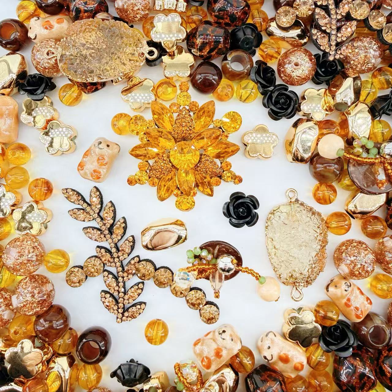 This isn't just jewelry making; it’s bottling the glow. 🌟 Featuring artisan tortoiseshell-chic beads, dramatic black rosette accents, and playful honey-bear talismans, every charm tells a story of comfort, class, and Creative Joy. Whether you’re crafting a chunky statement necklace for a jazz lounge or a pair of warm-toned earrings that light up a winter coat, this mix brings that 'Cozy Luxury' soul with a major pop of Bling. Glow from within. Craft your joy ✨ and let your style shine like gold! 🌇🐻💛